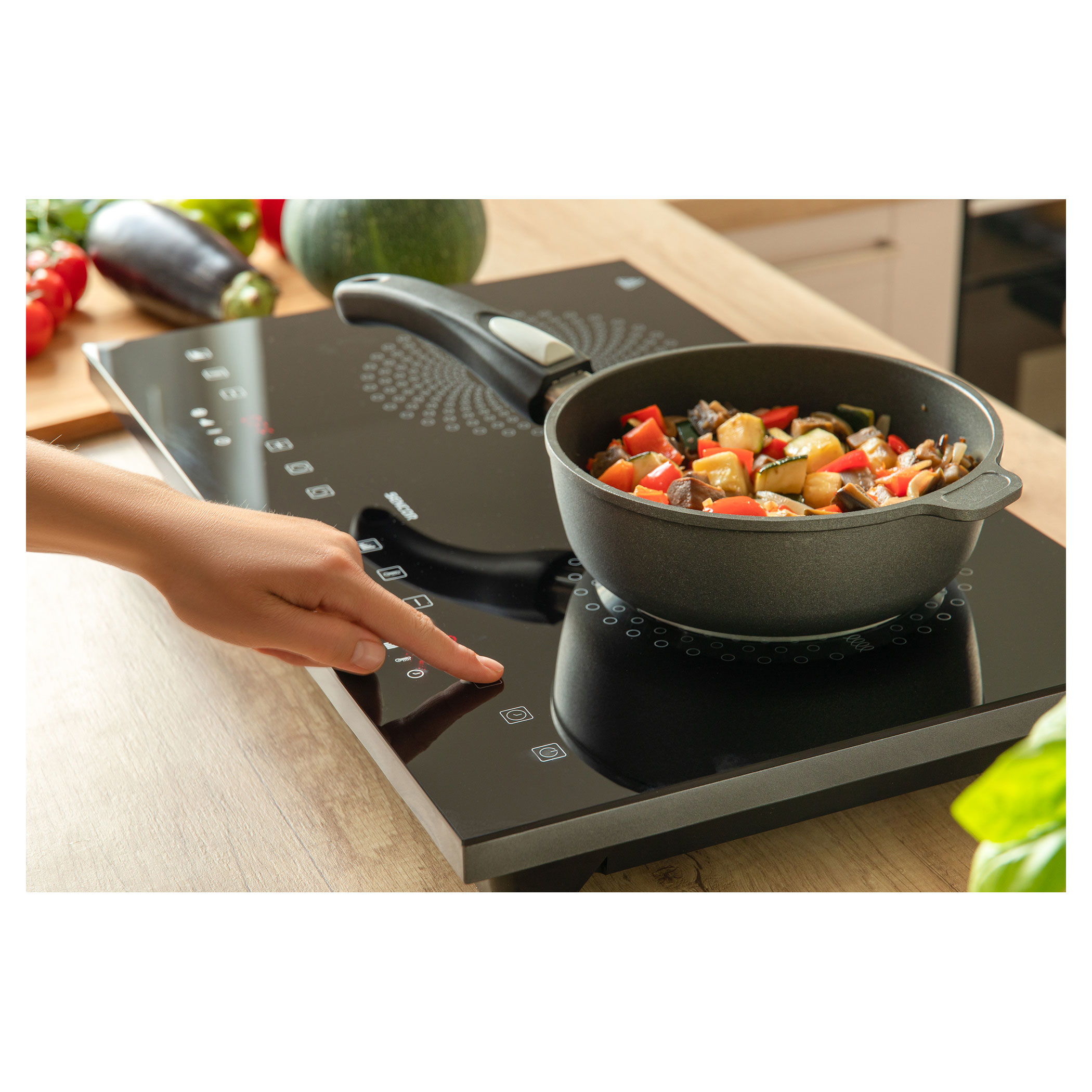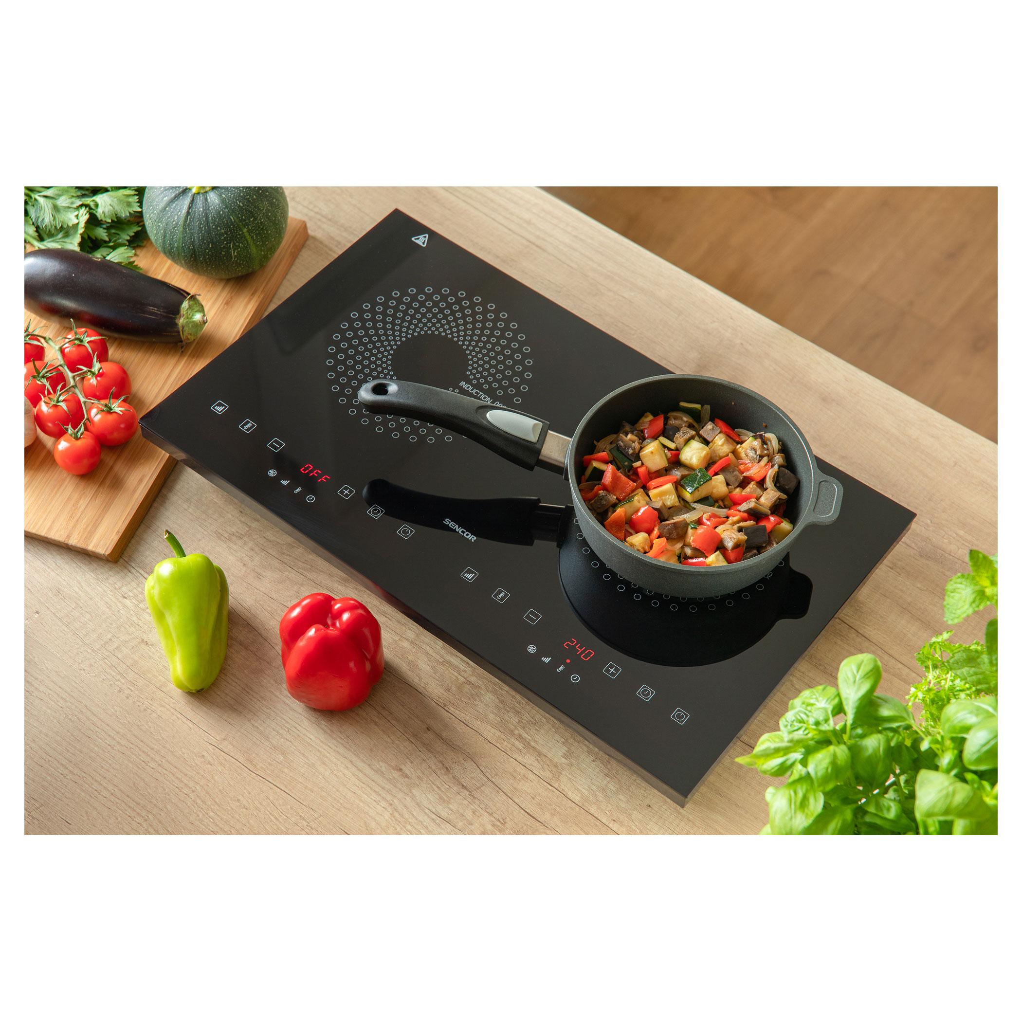 يتم التحكم في الموقد والوظائف الفردية باستخدام أزرار لمسية. شاشة LCD ذات إضاءة خلفية حمراء كبيرة توفر معلومات حول درجة الحرارة والطاقة.