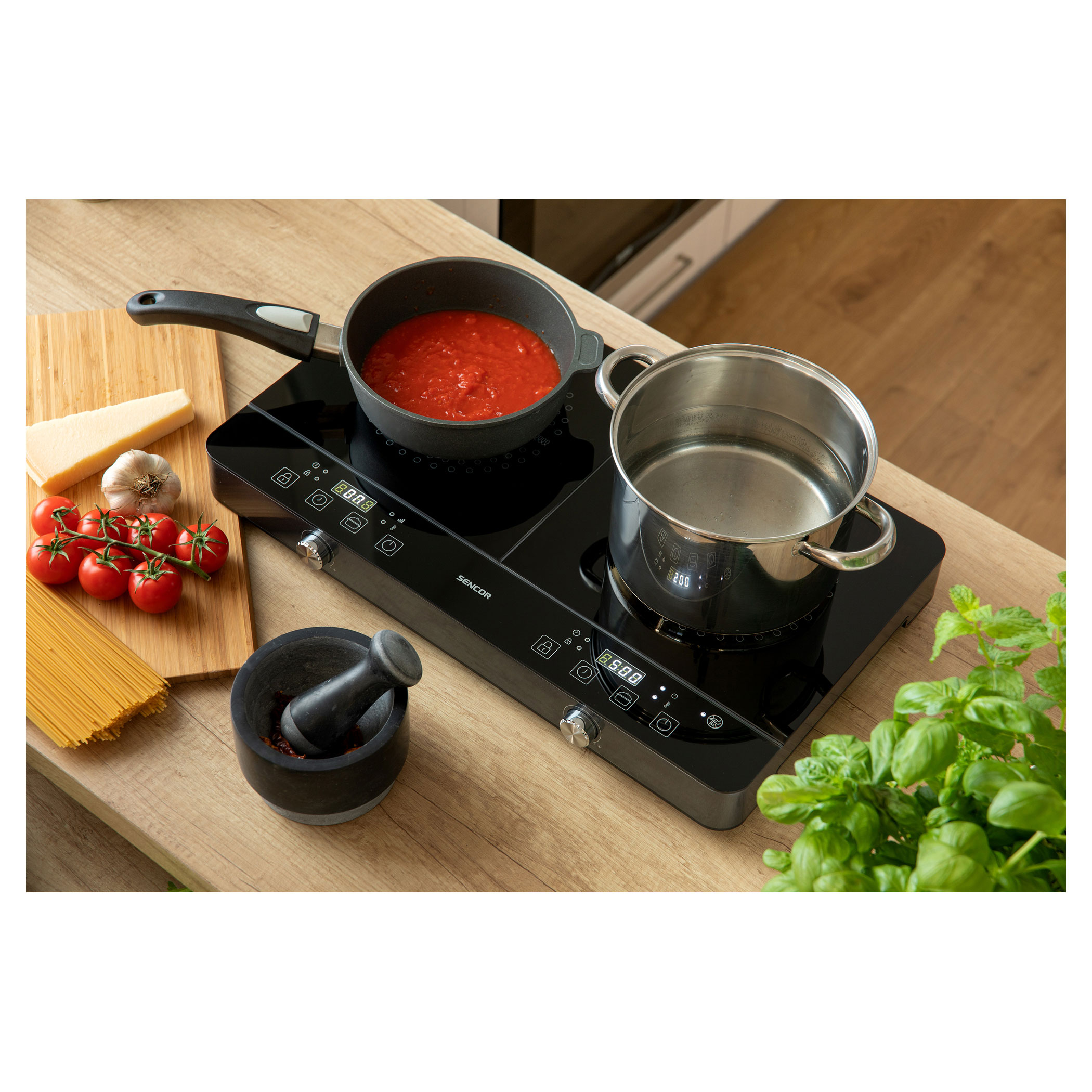 يوفر لوح التسخين بالتحريض الأيسر جميع مزايا الطهي بالتحريض. يمكن ضبط الطاقة بعشر زيادات تتراوح ما بين 200 إلى 1600 واط أو يمكن تحديد التحكم في درجة الحرارة في النطاق من 60 إلى 240 درجة مئوية.