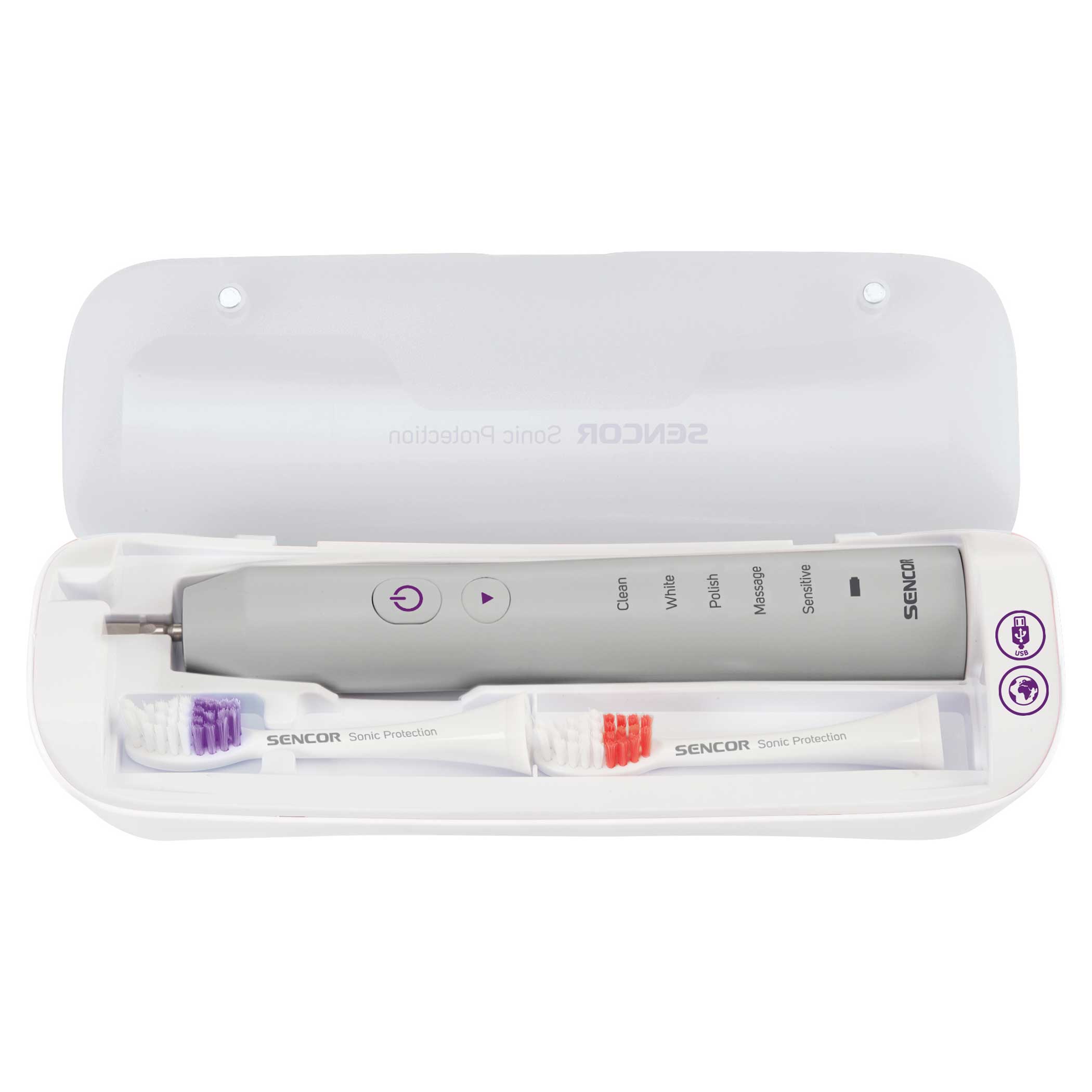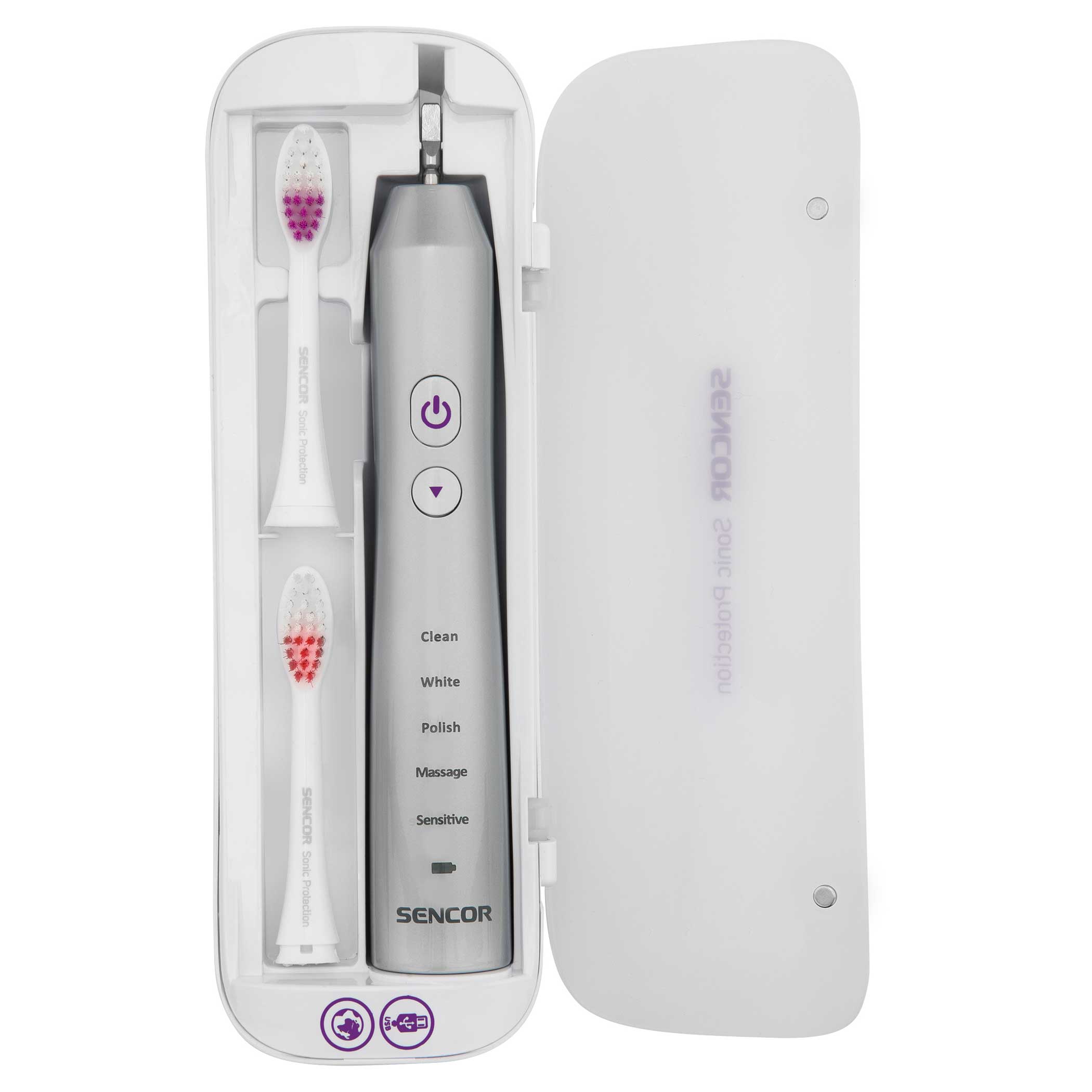 المحتويات المُضمنة: 1 هيكل فرشاة أسنان، 2 رؤوس أساسية، 1 محطة شحن مع حامل في واحد،